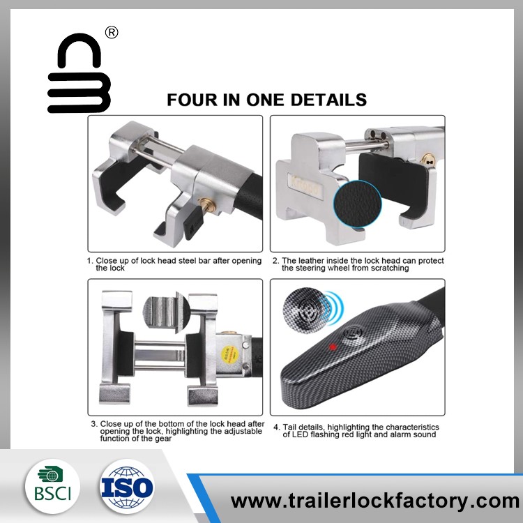 ·ปรับได้: แคลมป์พวงมาลัยสากลรถยนต์พร้อมระบบไฮดรอลิกแบบพับเก็บได้สามารถปรับได้ให้อยู่ในตำแหน่งที่แตกต่างกันสำหรับพวงมาลัยขนาดต่าง ๆ หัวกล้องโทรทรรศน์ การออกแบบที่สง่างามด้วยขอบโค้งมนร่างกายของเหล็กตามหลักสรีรศาสตร์และเรียงรายไปด้วยหนังเลียนแบบลื่น ล็อคความปลอดภัยสามารถหมุนไปด้านข้างเล็กน้อยและไม่ส่งผลกระทบต่อภารกิจของการต่อต้านการโจรกรรม