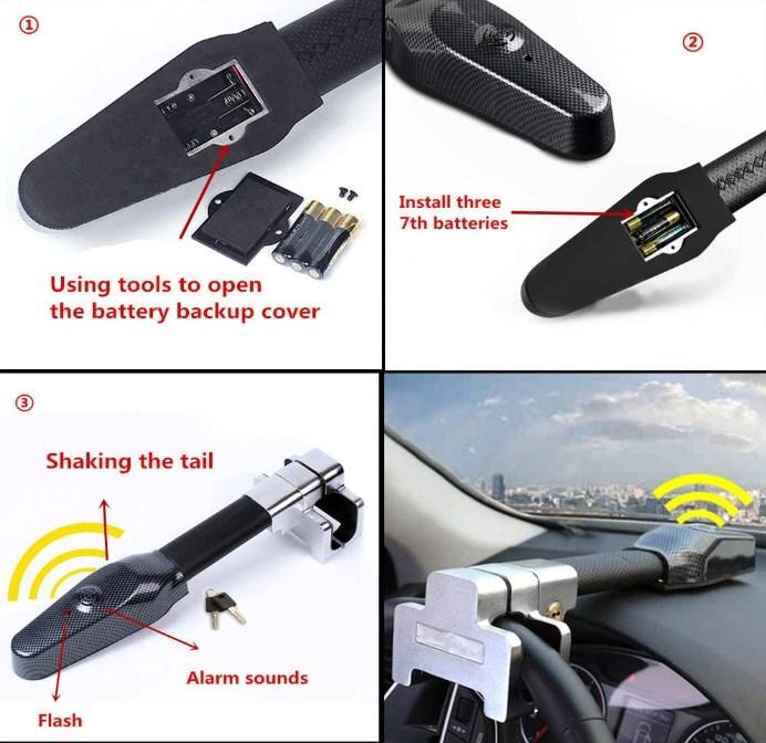 ล็อคสัญญาณเตือนพวงมาลัยพวงมาลัยด้วยสัญญาณเตือนเสียง 120 เดซิเบลพร้อมเซ็นเซอร์ช็อตและการเคลื่อนไหว ระบบเตือนภัยที่มีความล่าช้า 8 วินาทีหลังจากตำแหน่งเช่นเดียวกับเมื่อตรวจจับการเคลื่อนไหว สัญญาณเตือนใช้เวลา 8 วินาทีในการเริ่มเสียงเรียกเข้าเพื่อที่จะตัดการเชื่อมต่อและหลีกเลี่ยงความรู้สึกไม่สบายในกรณีที่ไม่ประมาท ต้องใช้แบตเตอรี่ AAA 3 ก้อน